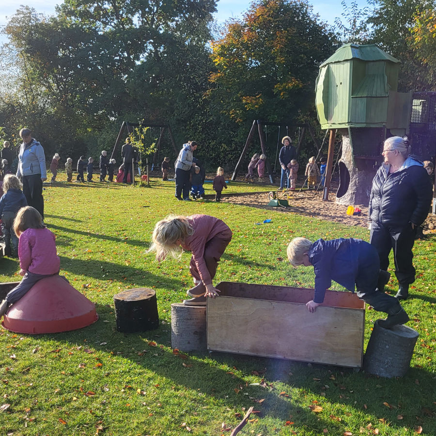 Sidst på eftermiddagen går vi måske hen på børnehavens legeplads og hygger med børnehavebørnene.