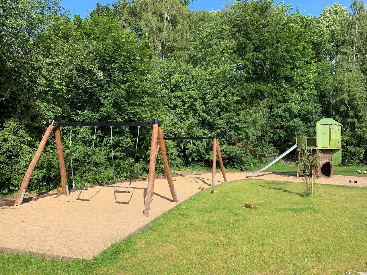 Vores legeplads er omgivet af krat, skov og skrænter. Legepladsens indretning lægger op til, at børnene udvikler sig godt motorisk og sansemotorisk.