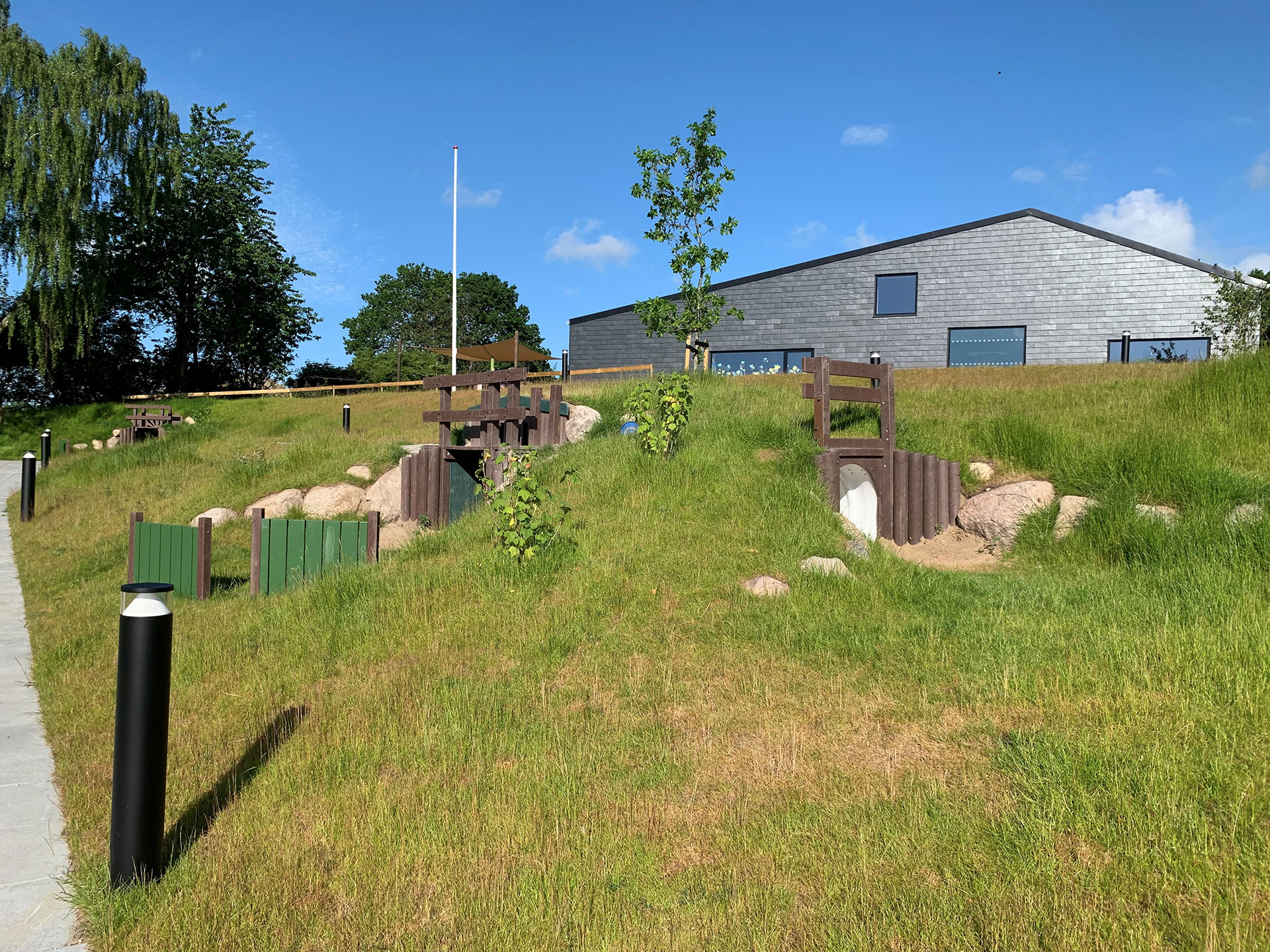 Vores legeplads er omgivet af krat, skov og skrænter. Legepladsens indretning lægger op til, at børnene udvikler sig godt motorisk og sansemotorisk.